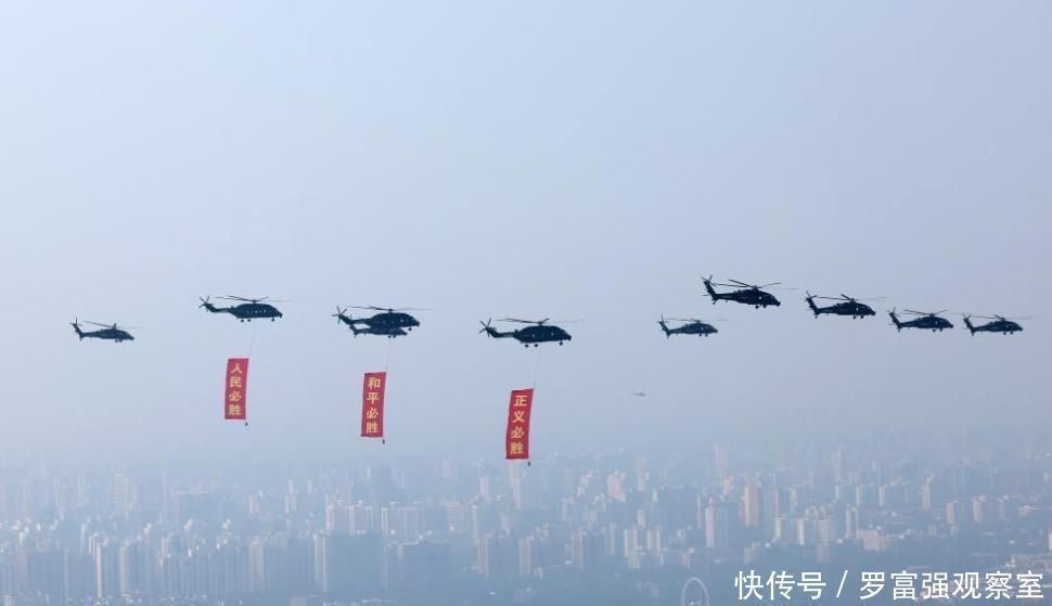 由 3 架直 - 8L 运输直升机和 7 架直 - 20T 直升机组成。3 架直 - 8L 运输直升机分别悬挂 “正义必胜”“和平必胜”“人民必胜” 条幅,有7架直-20T直升机排成三角的队形,把标语围在中间。