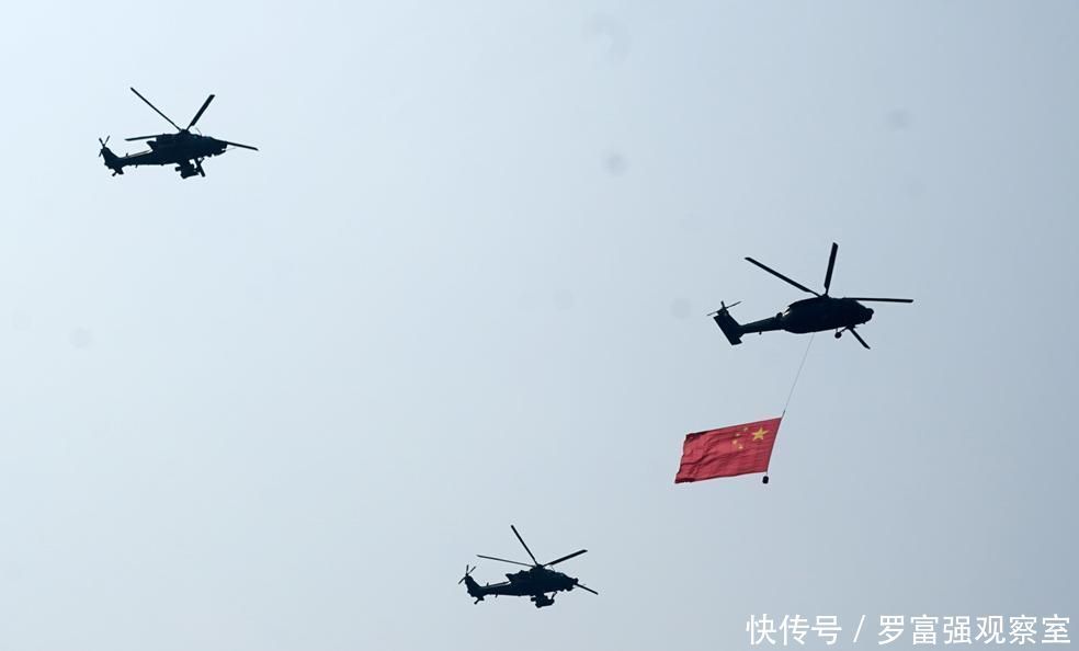 这个护旗编队啊,是由3架直-20通用直升机和6架直-10武装直升机一块儿编成的。3架直-20分别挂着党旗、国旗和军旗,每架直-20后面都有2架直-10跟着,一起组成编队来护航。