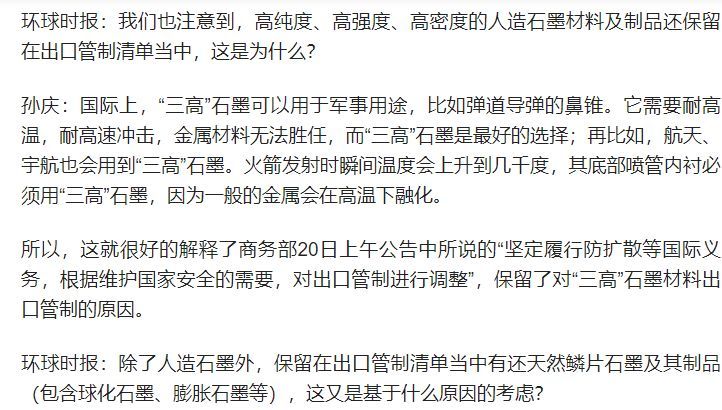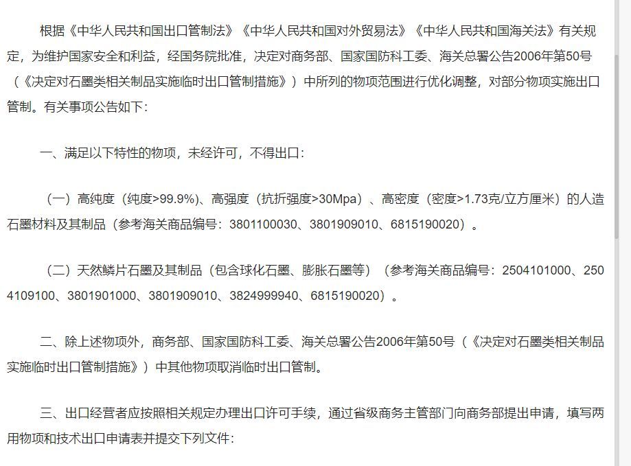 我国商务、海关总署在2023年10月20日发布关于“优化调整石墨物项临时出口管制措施”的公告。当时,商务部新闻发言人曾表示,对特定石墨物项实施出口管制是国际通行做法。中国作为全球最大的石墨生产国和出口国,长期以来,坚定履行防扩散等国际义务,根据维护国家安全和利益需要,依法对特定石墨物项实施出口管制,对部分石墨物项实施临时管制。