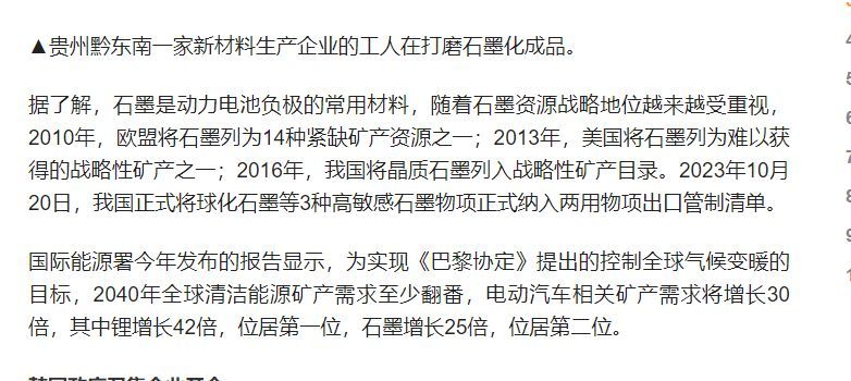 据报道,石墨是动力电池负极的常用材料,随着石墨资源战略地位越来越受重视,2010年,欧盟将石墨列为14种紧缺矿产资源之一,美国则在2013年将石墨列为难以获得的战略性矿产之一。